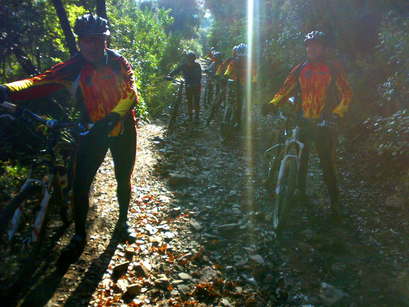 La ruta empezo por el colegio de Sant Climent,ermita del Roser ,para empezar no esta mal,bajada por la supertrialera que nos deja casi en Can Bruguera,y vuelta para subir a San Martin de Porres y el mirador de la Costa Fustera,superbajada hasta la Cruz de Querol,y vuelta para coger la supersubida de San Anton,donde algunos ya ibamos tocaditos,trialera nueva para nosotros a cargo de Jorge ,amigo de Miguel que hoy nos acompaño,vuelta para llegar a Estrech de Rocas y coger la subida a Sant Ramon,administrando fuerzas y dosificando (algunos,otros no tanto)conseguimos llegar a la cuarta ermita del dia,en la bajada se termino de dividir el grupo bajando unos por la trialera "facil",y otros por el ya bautizado como woodpark de Sant Ramon ,que es la megatrialera que nos lleva a la riera de Sancli.
